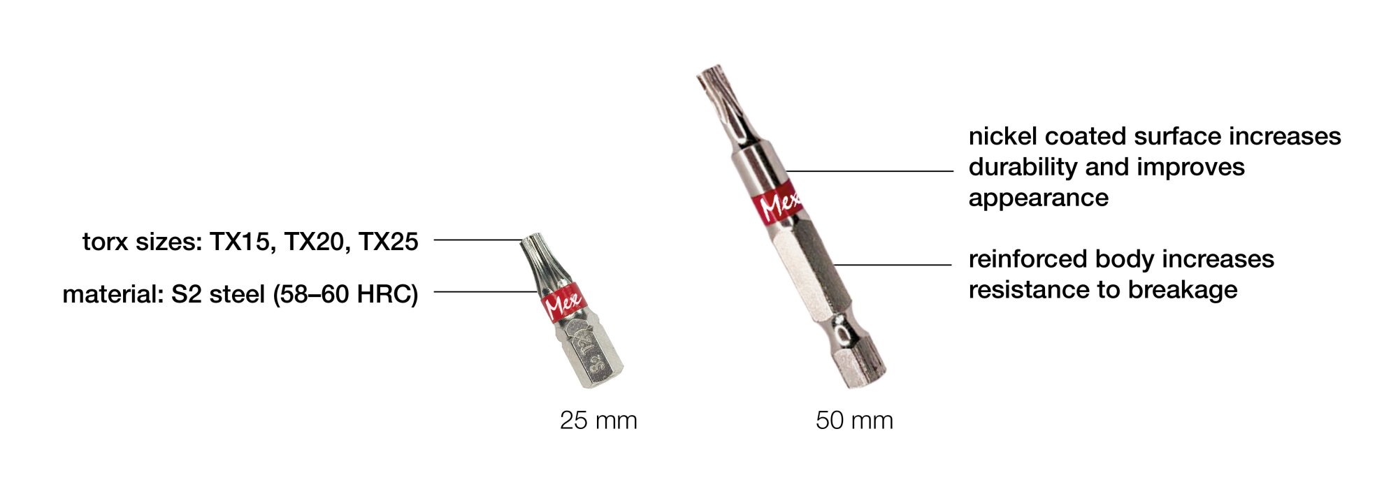 | Nickel-coated Bits | TX15, TX20, TX25 | 50 mm | Steel S2 | Nickel plating |