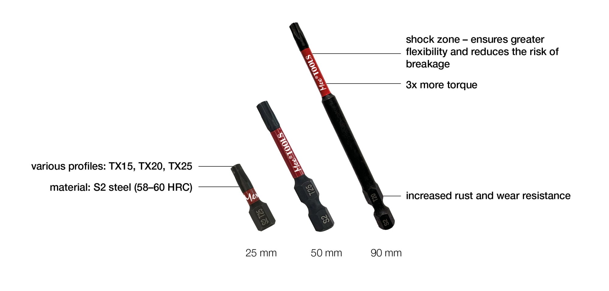 MEX-TOOLS Hobby bits are made of high-quality S2 steel, known for superior torsional strength and impact resistance. The heat-treated core (HRC 58–60) provides long life and resistance to deformation. The manganese phosphate + anti-corrosion coating enhances durability, protects against rust, and reduces friction for smoother, more efficient fastening.
